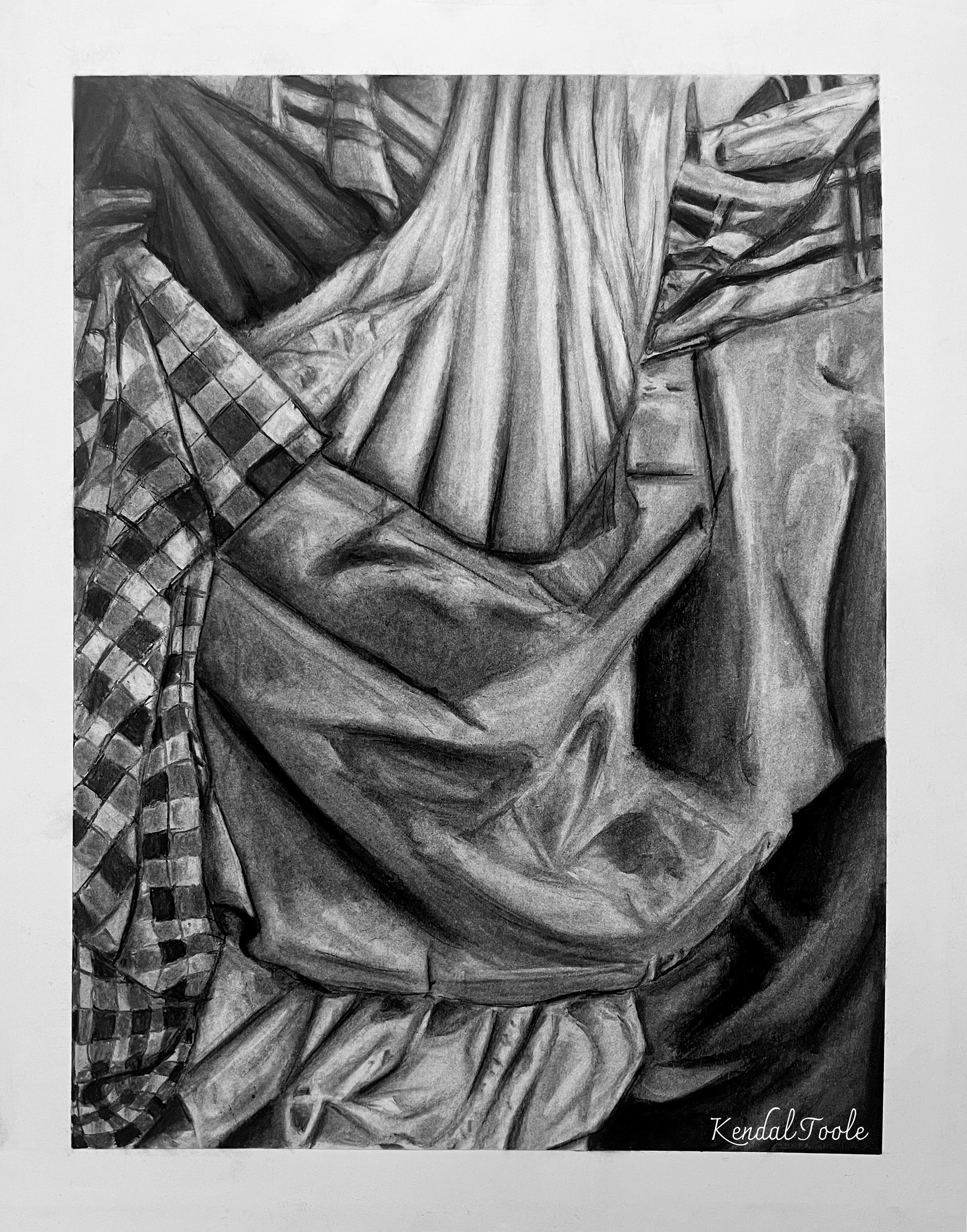 I wanted to challenge myself to capture the essence of fabrics through drawing. DRAPERY includes many types of fabric pieces, such as checkered or striped. This gave me experience in drawing different fabric textures. Using graphite and charcoal, I studied and thoroughly rendered each piece of cloth.