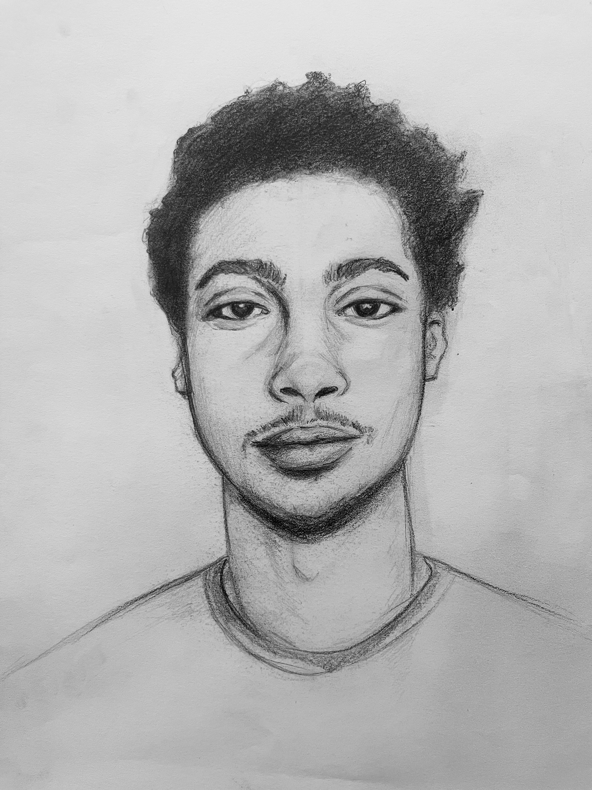 In order to create this piece, I had to use blending stumps and multiple kinds of graphite pencils. For the darkest parts of the portrait, I used an 8B, and for the lightest, I used a 2H pencil. These allowed me to create a realistic portrait drawing of the music artist, Bad Bunny.