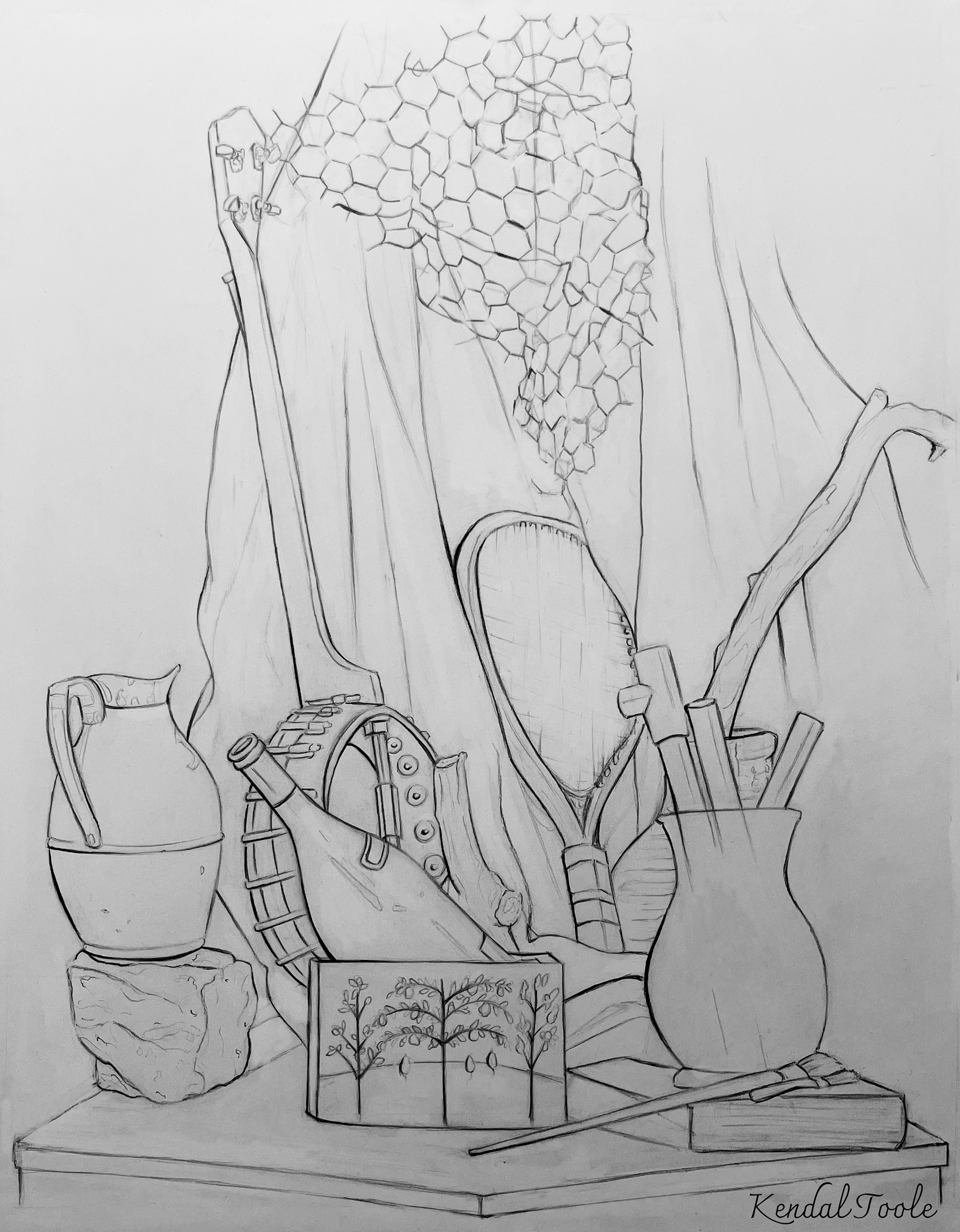 CONTOUR LINE STILL-LIFE was created by line weight and contour lines. By using these, I was able to capture the shadows and highlights of each object. This piece also gave me experience in drawing different textures (chicken wire, fabric, etc.) with lines.